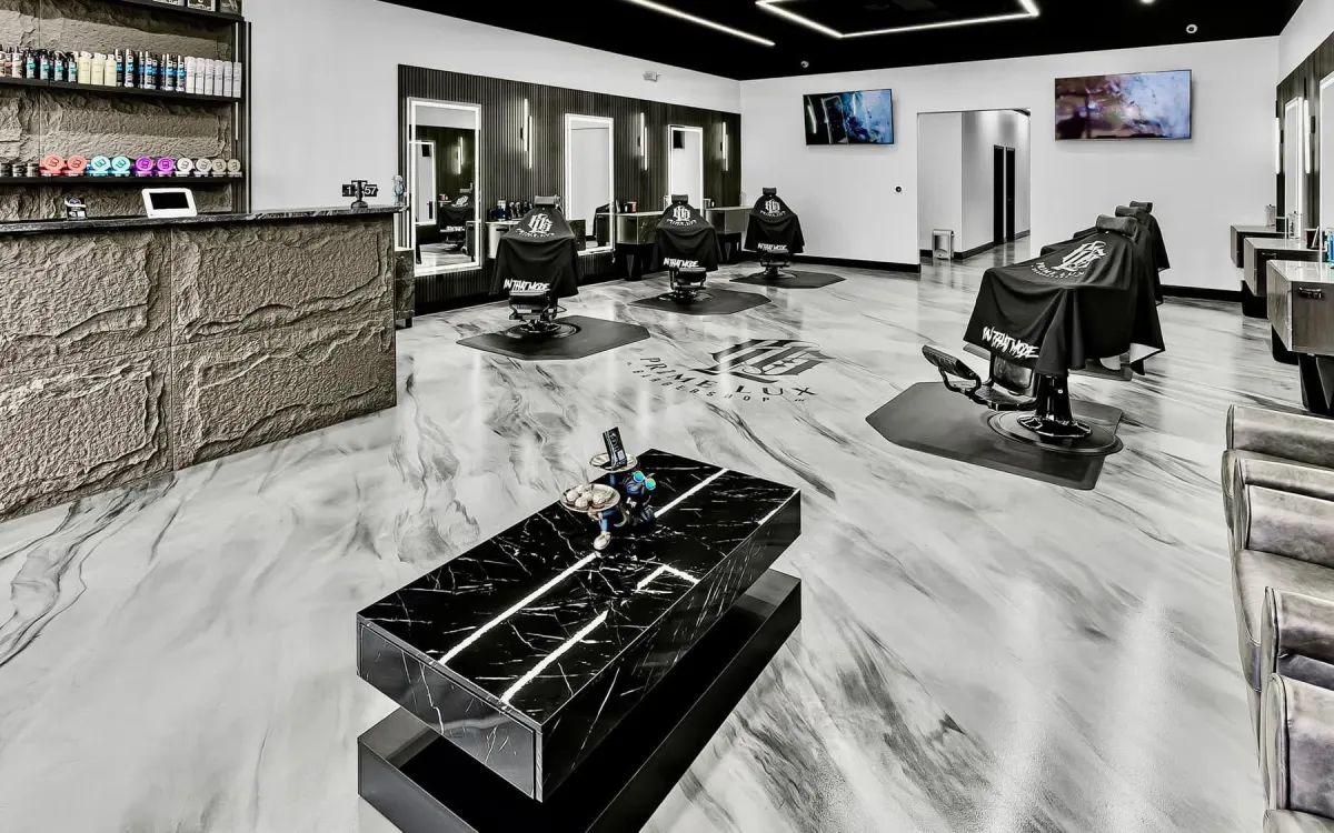 A high-performance polyaspartic topcoat seals the system, locking in the metallic effects while delivering UV, chemical, and abrasion resistance. The result is a glossy, durable surface built to last.