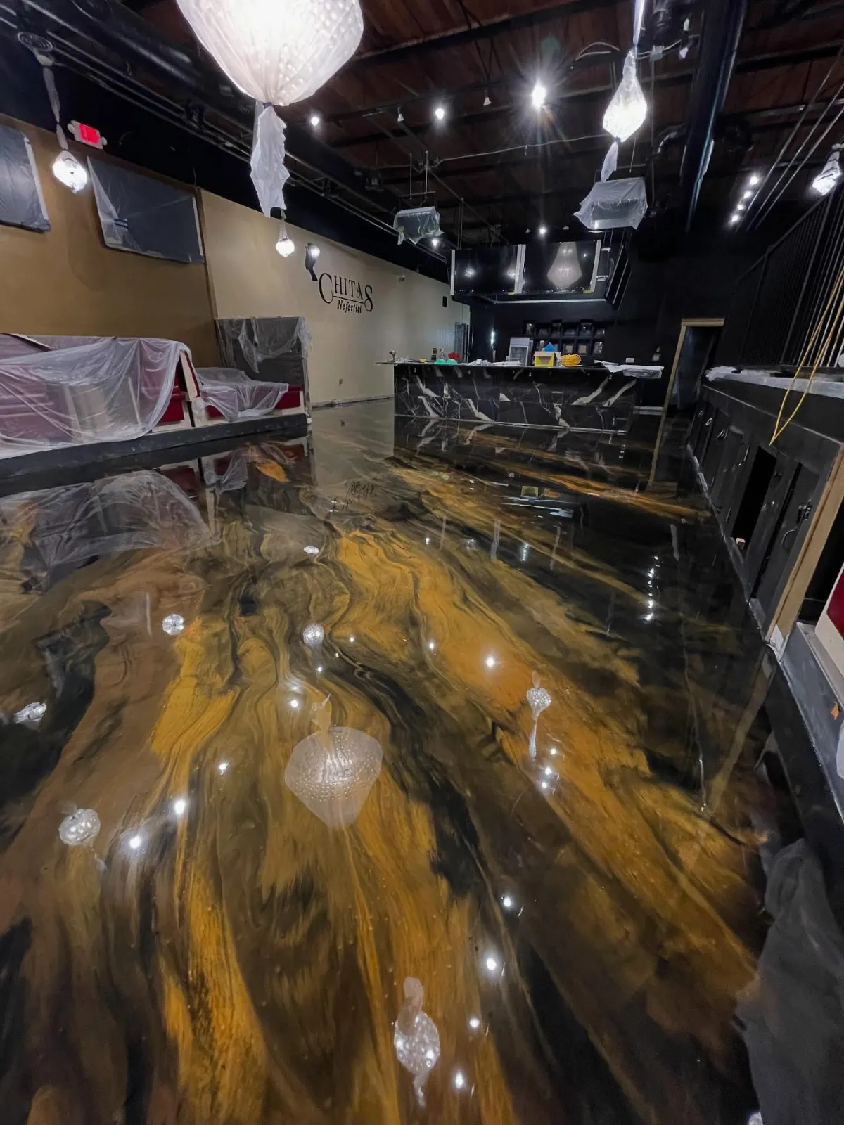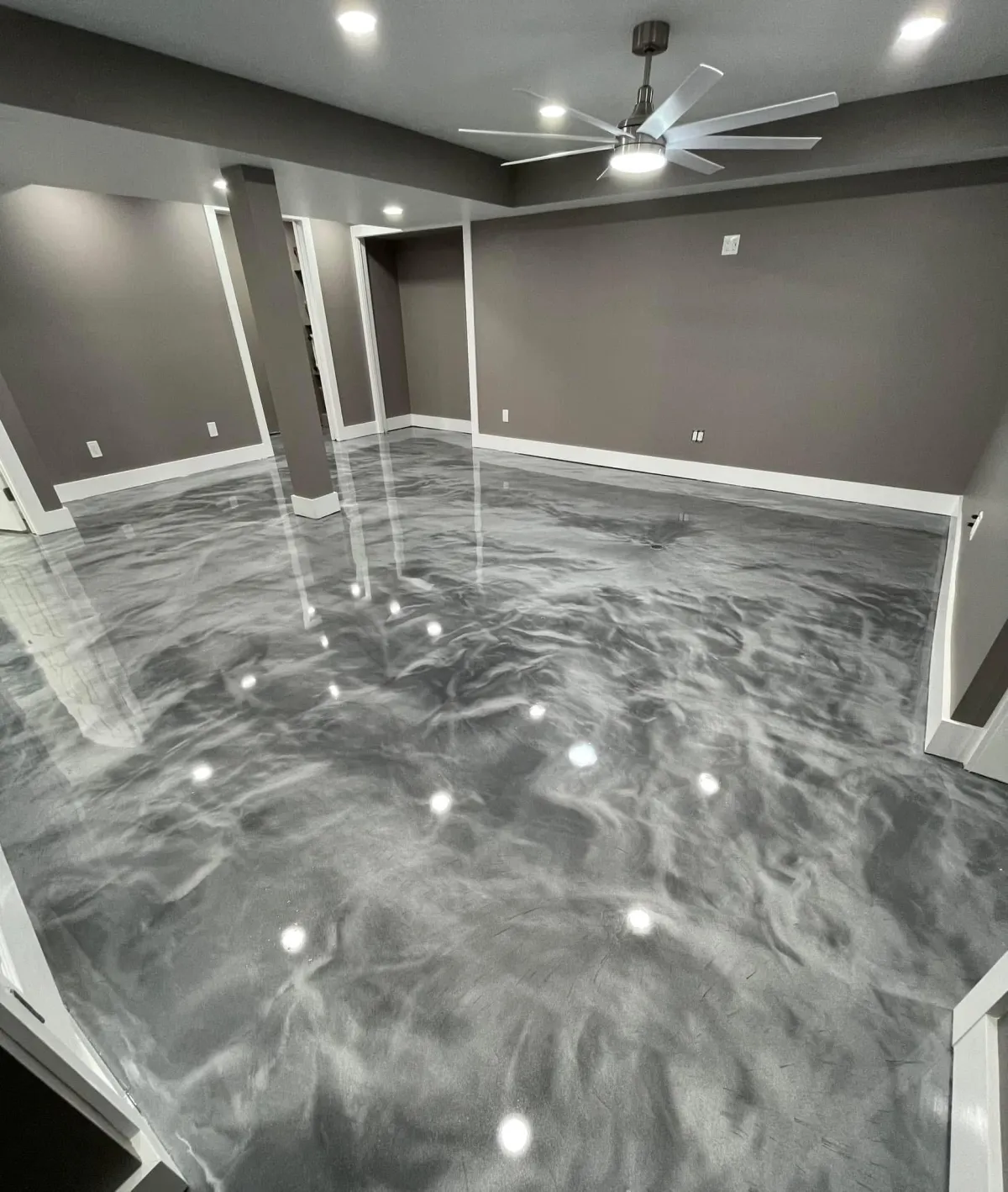 Special metallic pigments are blended into the epoxy, creating dynamic, three-dimensional patterns. Each floor is unique, with colors and effects that change as the light shifts.